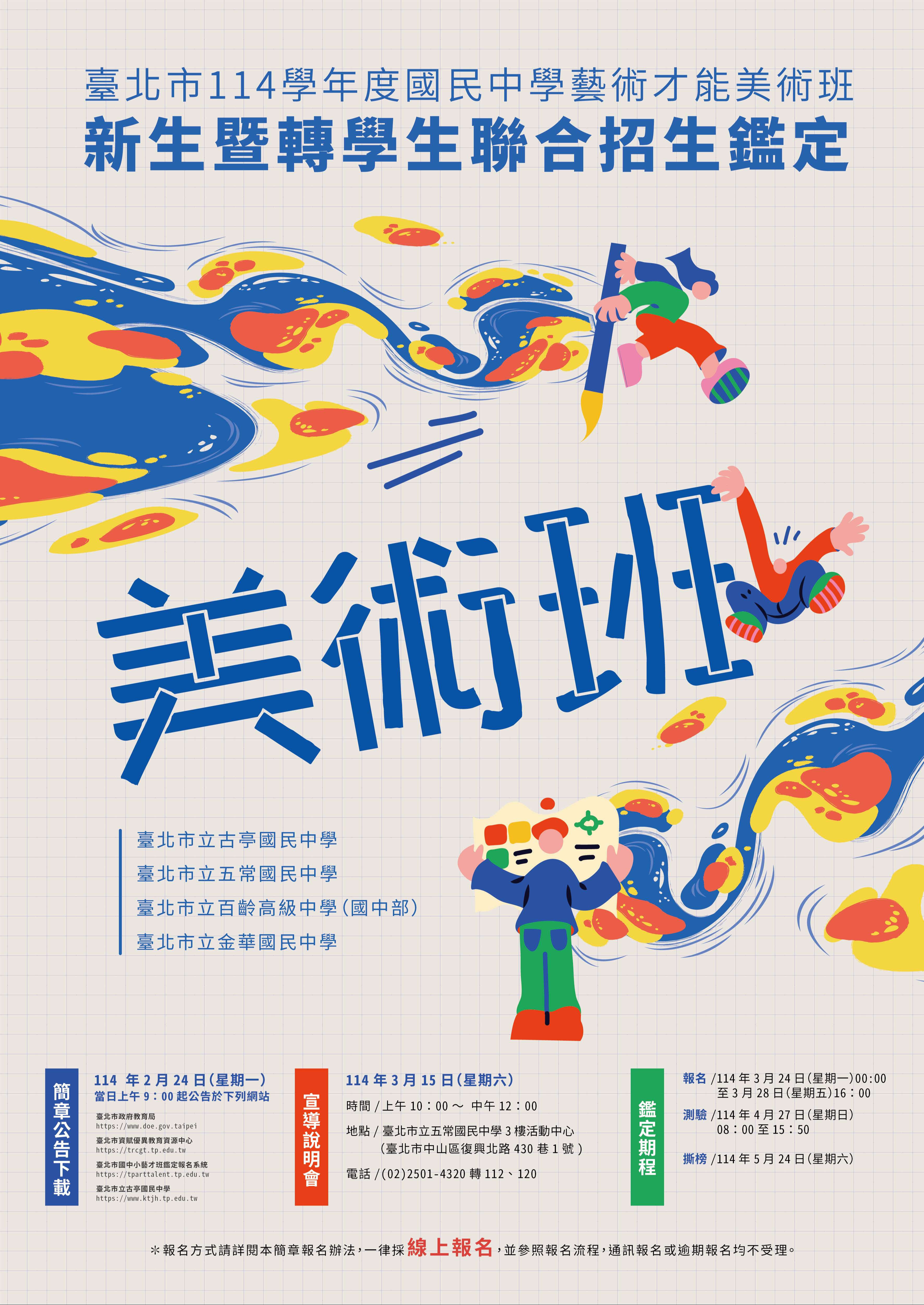 114學年度招生鑑定報名自114年3月24日(星期一)0:00至3月28日(星期五)16:00,3月15日宣導說明會,4月27日測驗,5月24日撕榜,詳情請參閱附件海報。