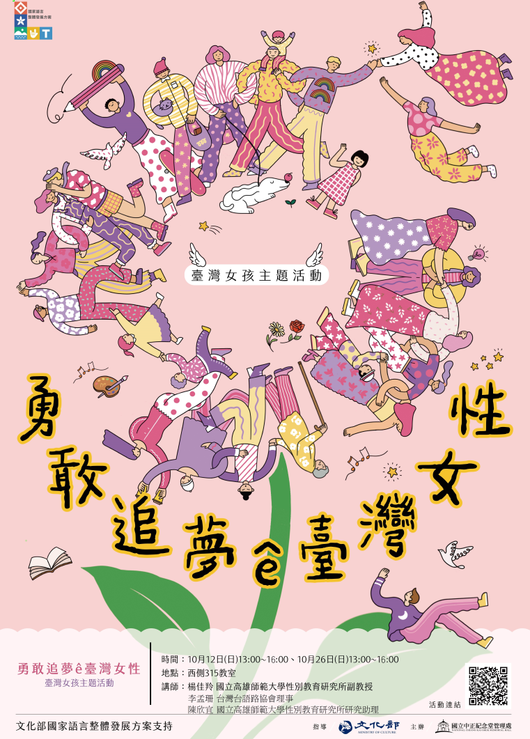 二、為推廣臺灣台語學習,並響應性別平權的核心精神,國立 中正紀念堂管理處於114年10月12日、114年10月26日辦理 旨揭主題活動2場次,引導兒童、青少年認識臺灣女性藝術 家的生命故事與創作歷程,學習以臺灣台語表達臺灣女孩 的特質與價值,培養多元身體意象、文化認同及自我表達 能力。