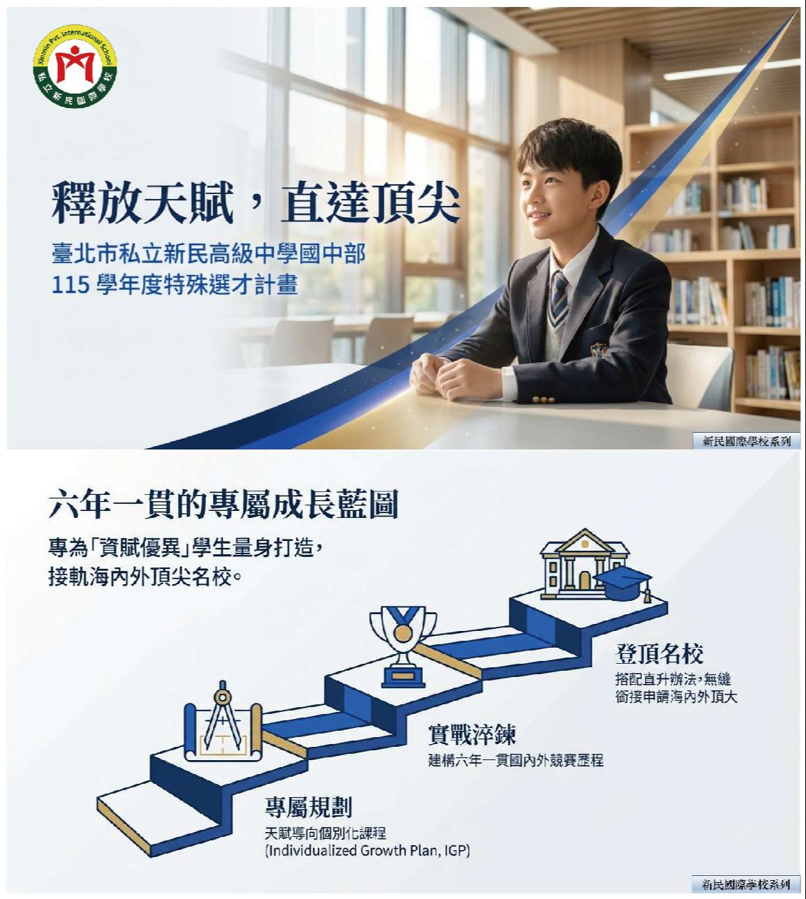 一、目的:專為特定領域「資賦優異」孩子,依據個別化的需 求,量身打造六年一貫天賦導向個別化課程 (Individualized GrowthPlan, IGP),並搭配本校直升辦 法,專注延續發展既有天賦,建構六年一貫國際/國內競賽 歷程,銜接申請海內外頂大名校。